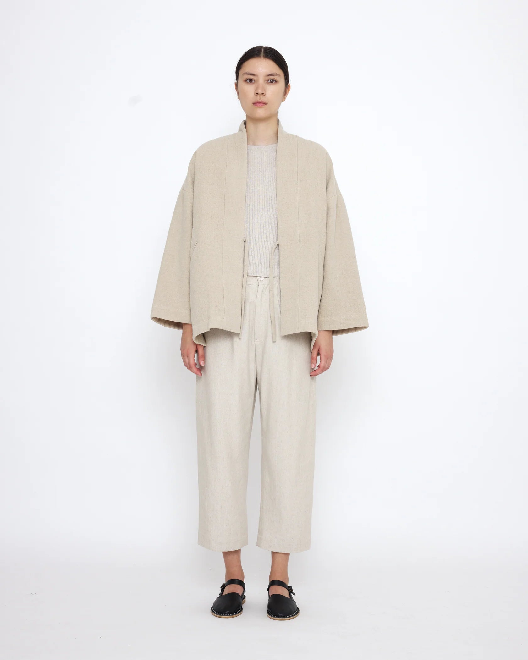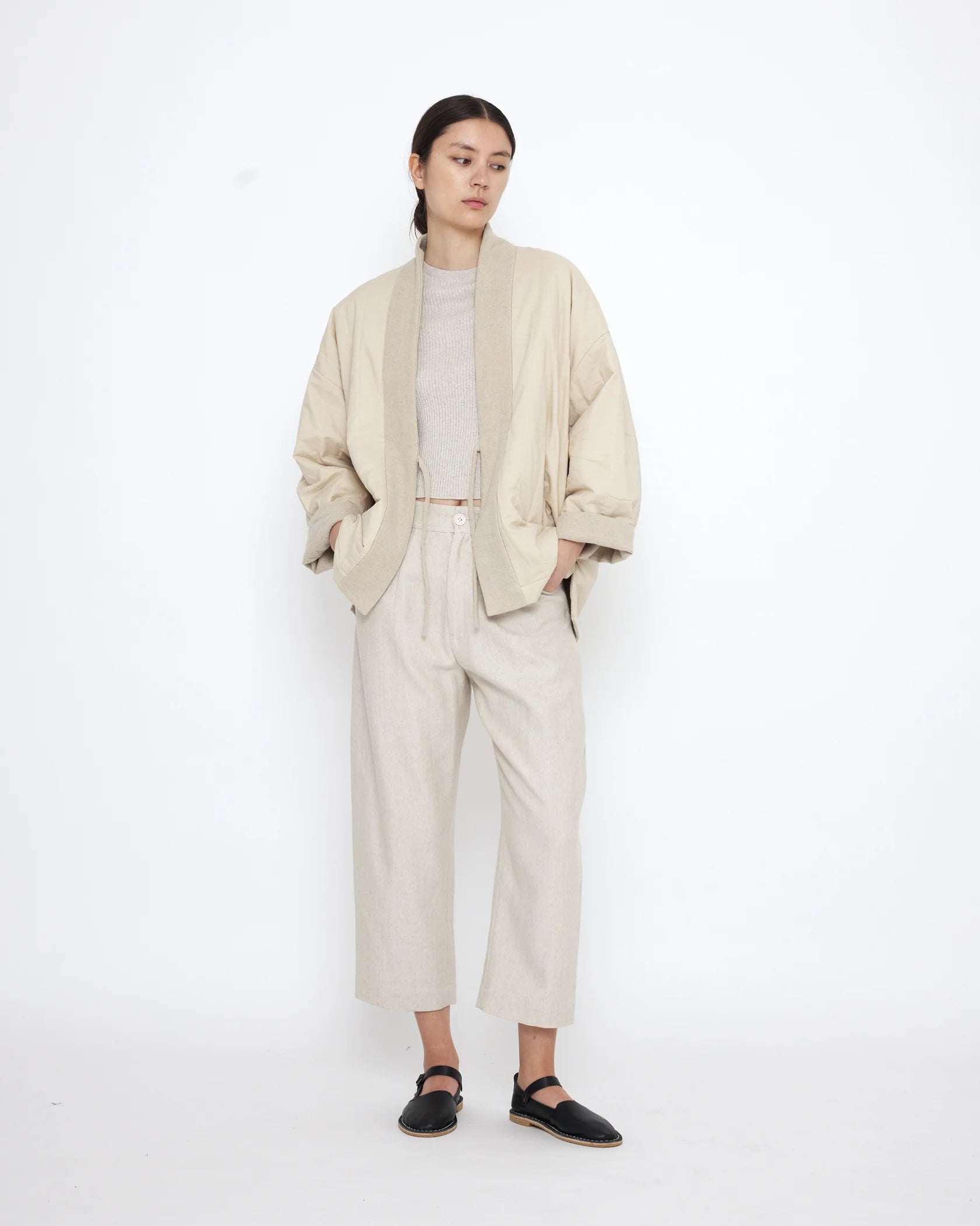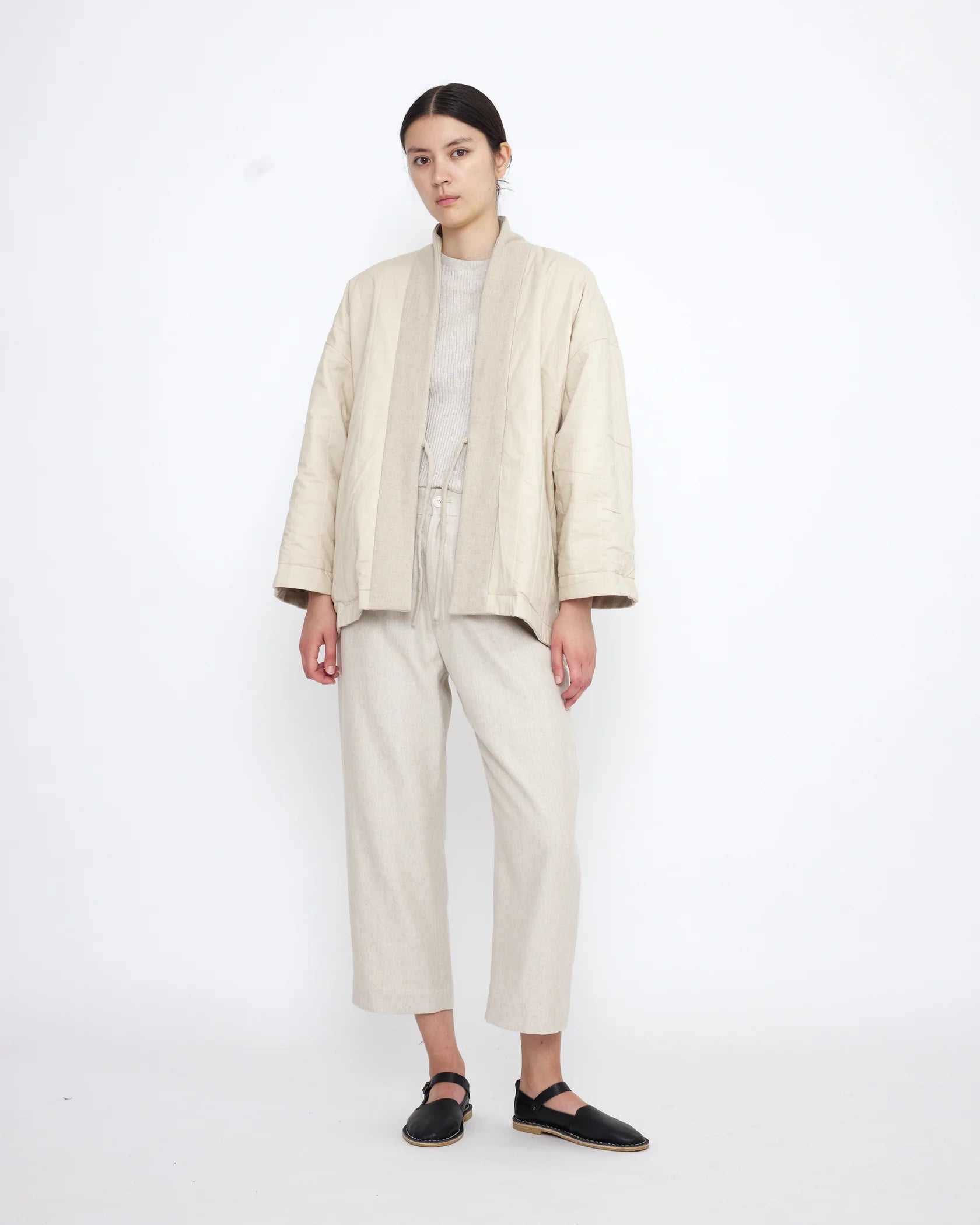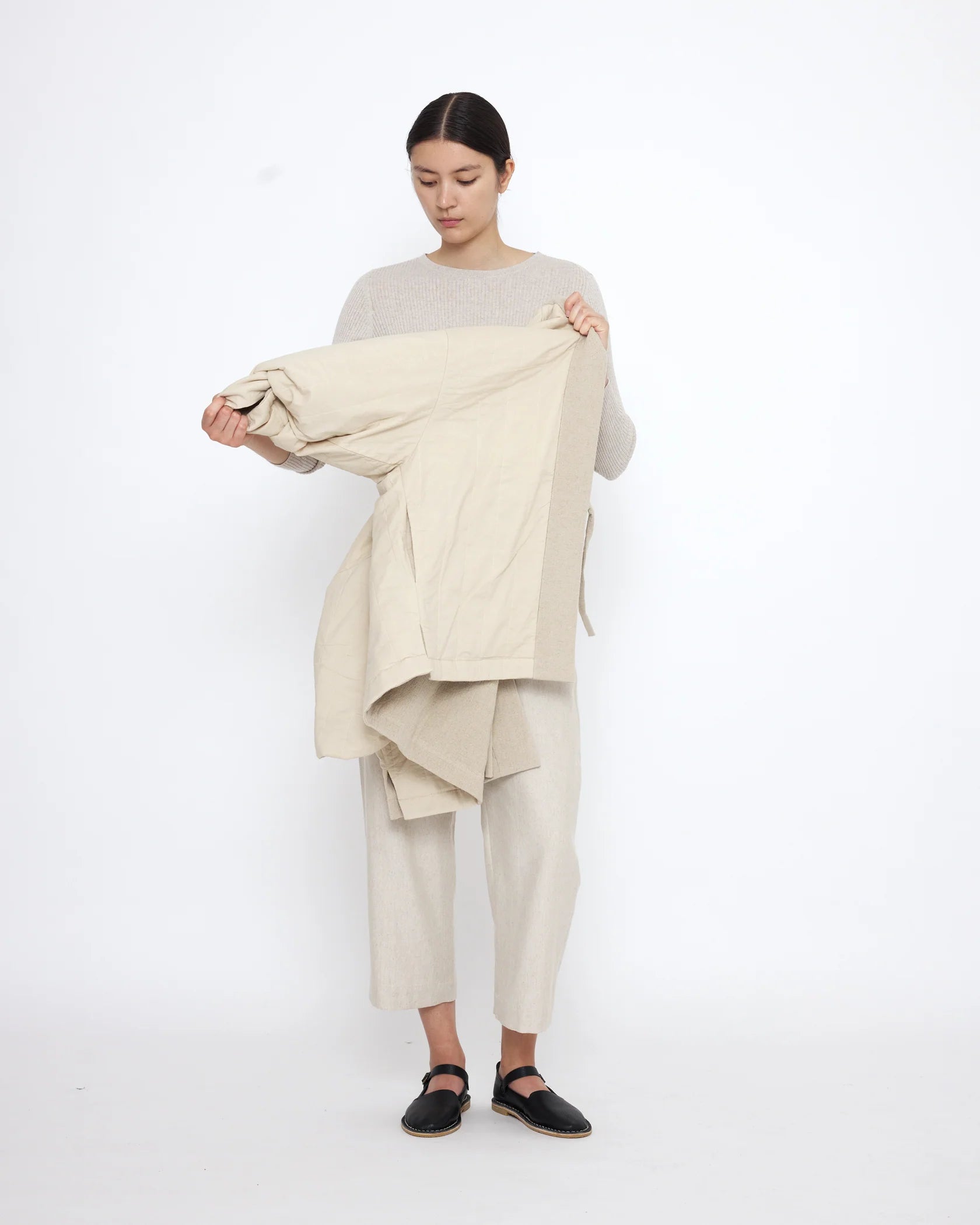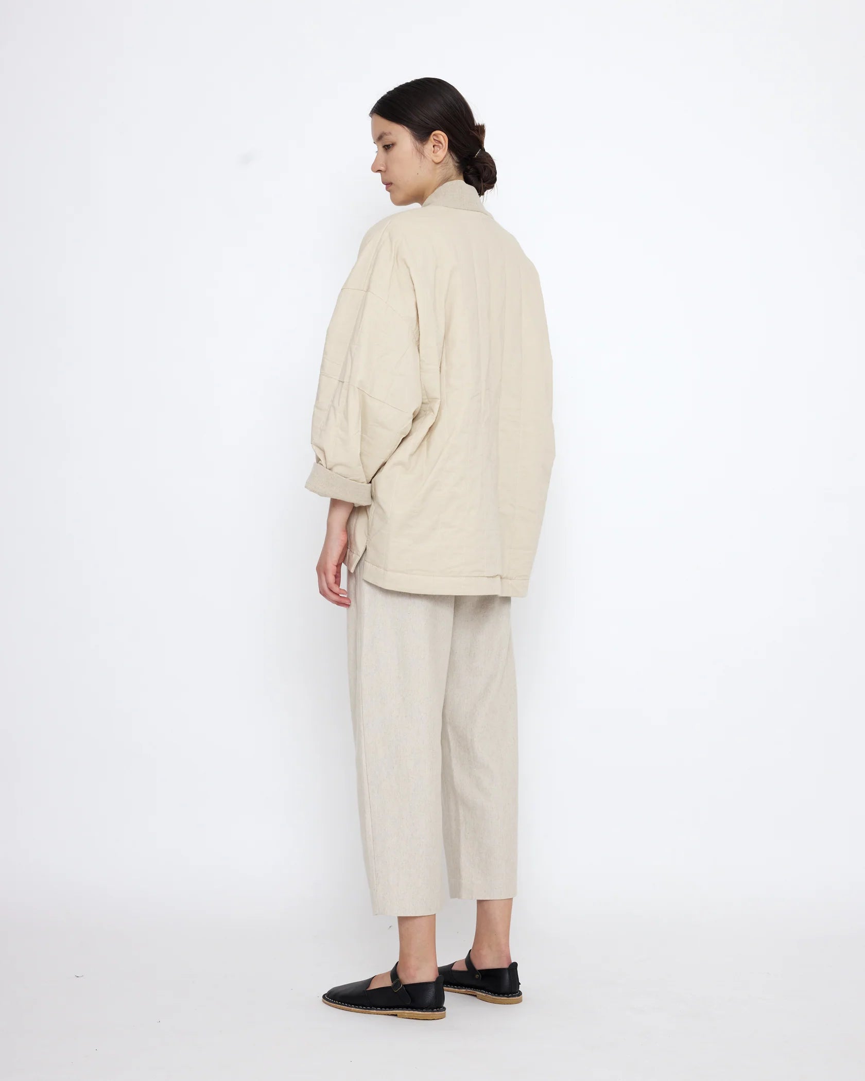 A lightweight and padded short jacket with a reversible construction. One side crafted from an earthy, textured cotton-linen and the other featuring a soft, quilted finish. Cut in a cocoon silhouette. Clean collarless design, dropped shoulders, and relaxed wide long sleeves. Side inseam pockets on both sides and a simple tie closure.