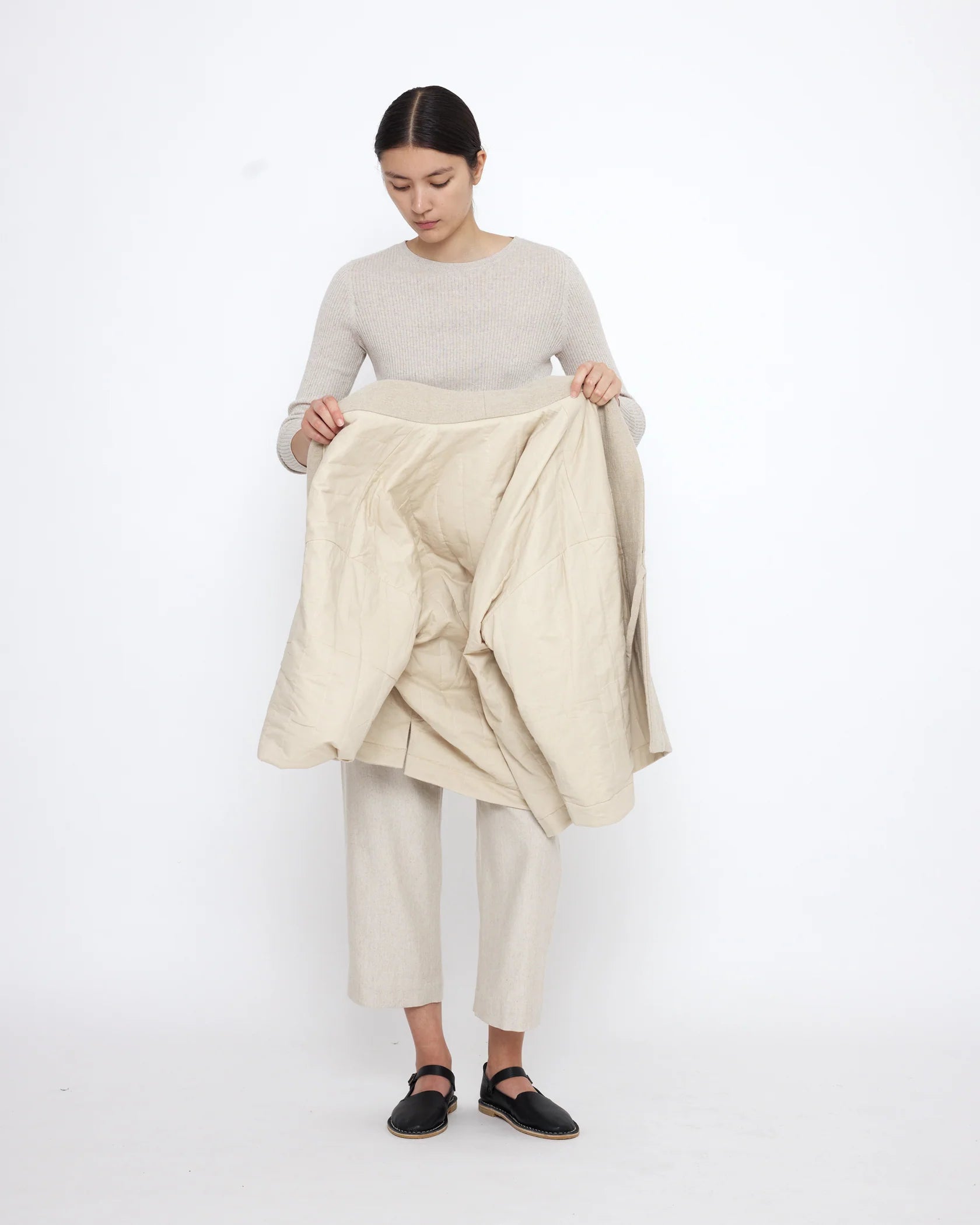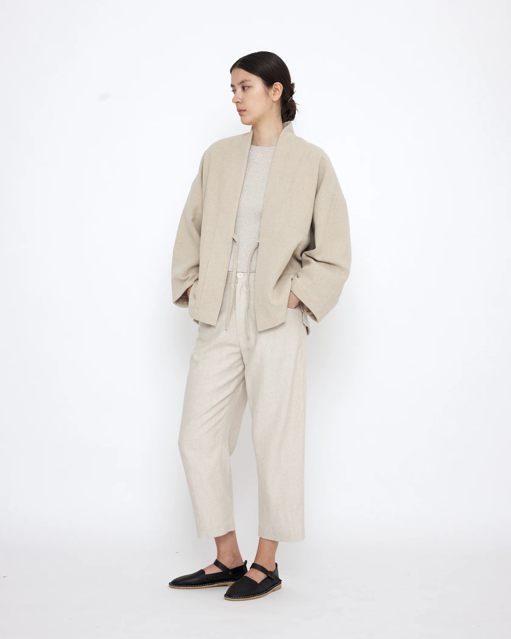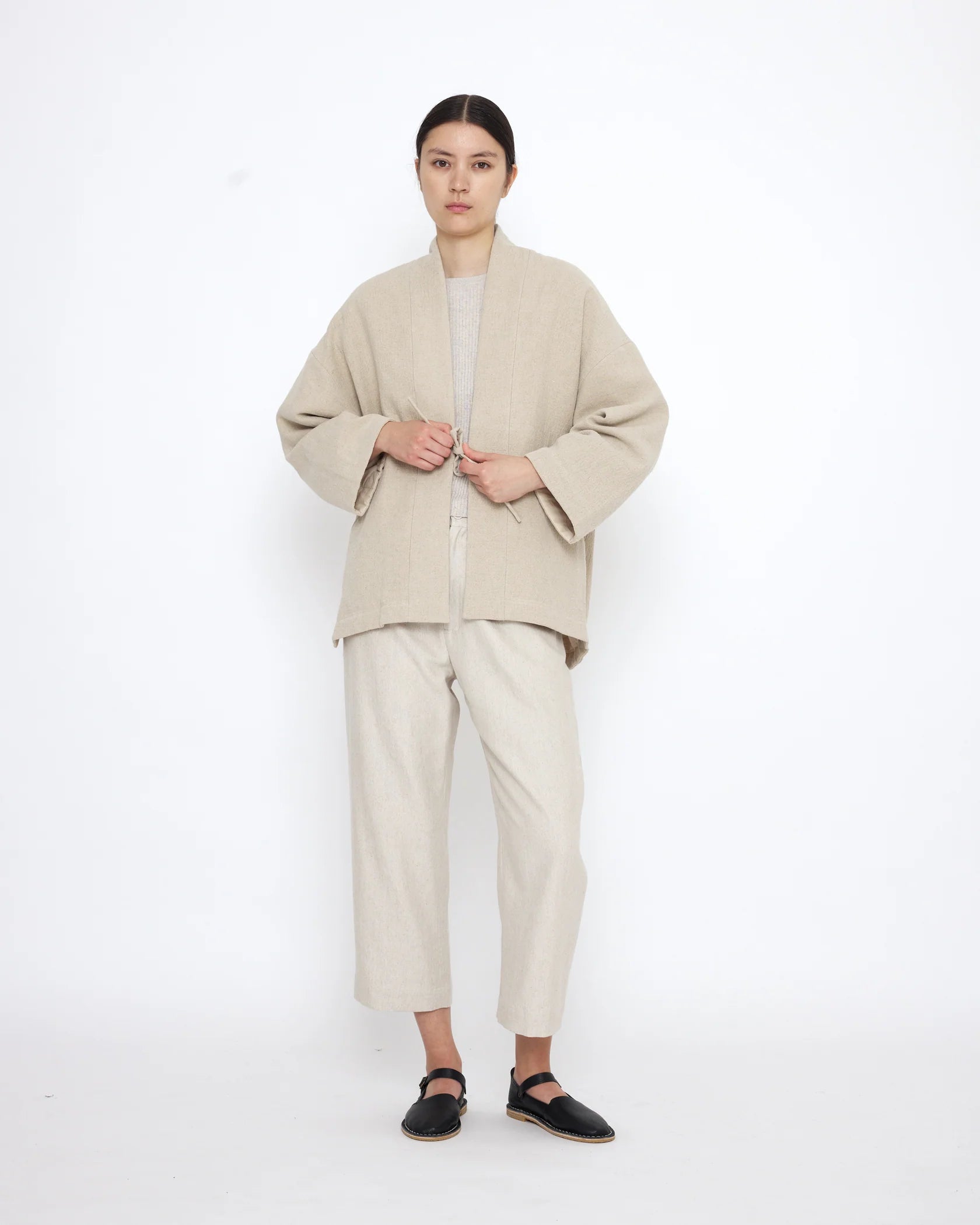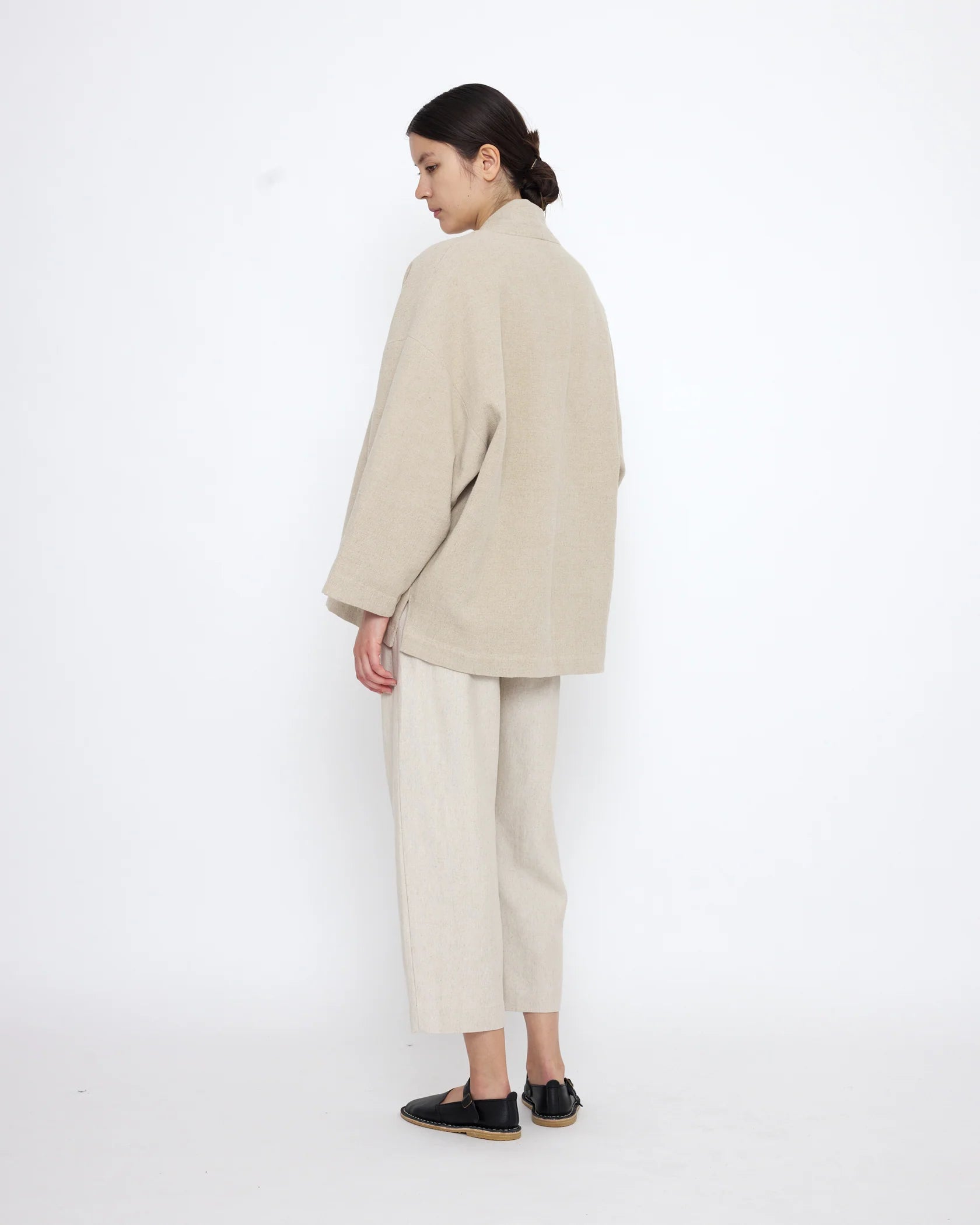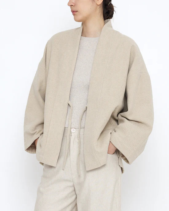 A lightweight and padded short jacket with a reversible construction. One side crafted from an earthy, textured cotton-linen and the other featuring a soft, quilted finish. Cut in a cocoon silhouette. Clean collarless design, dropped shoulders, and relaxed wide long sleeves. Side inseam pockets on both sides and a simple tie closure.