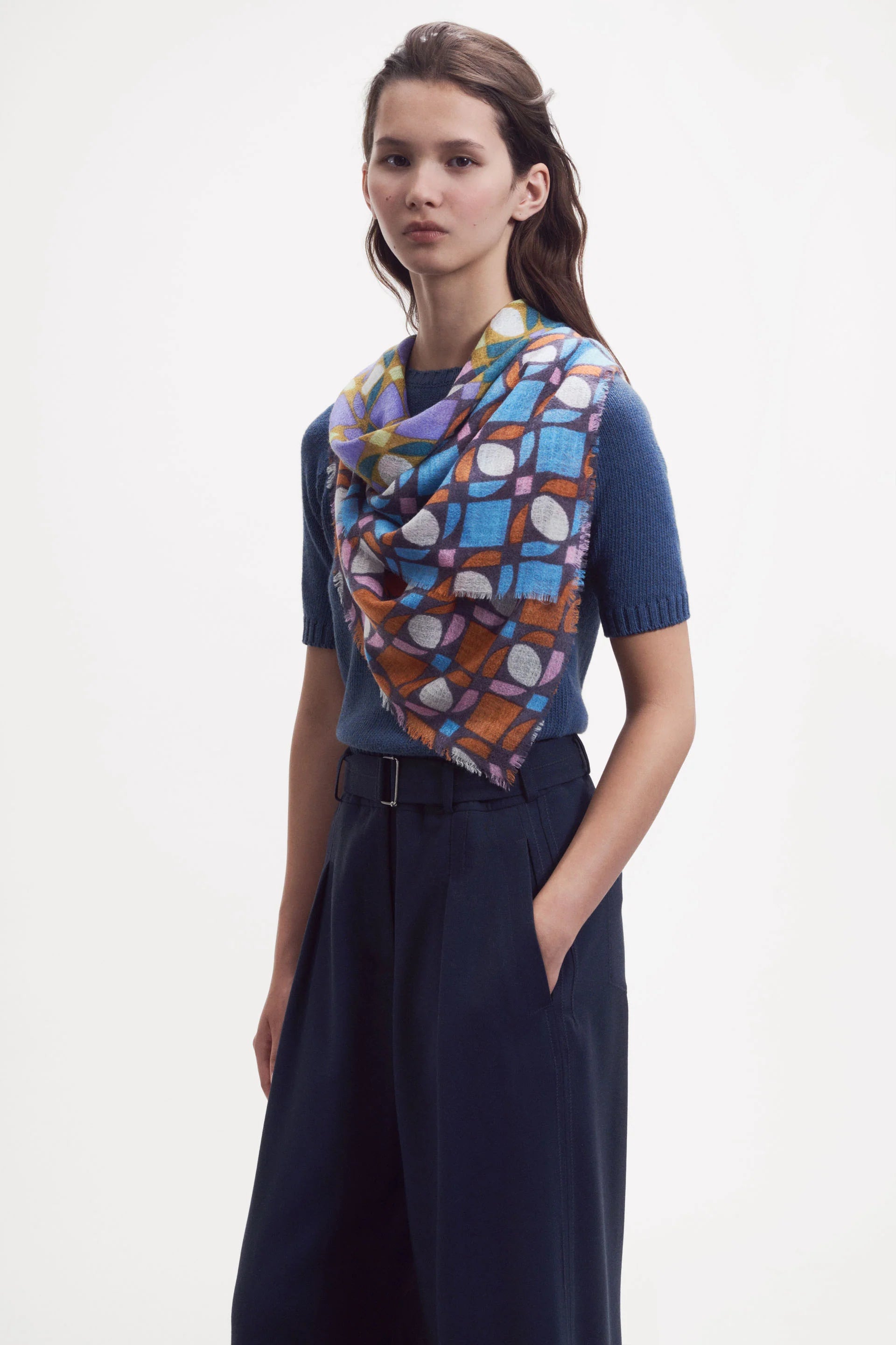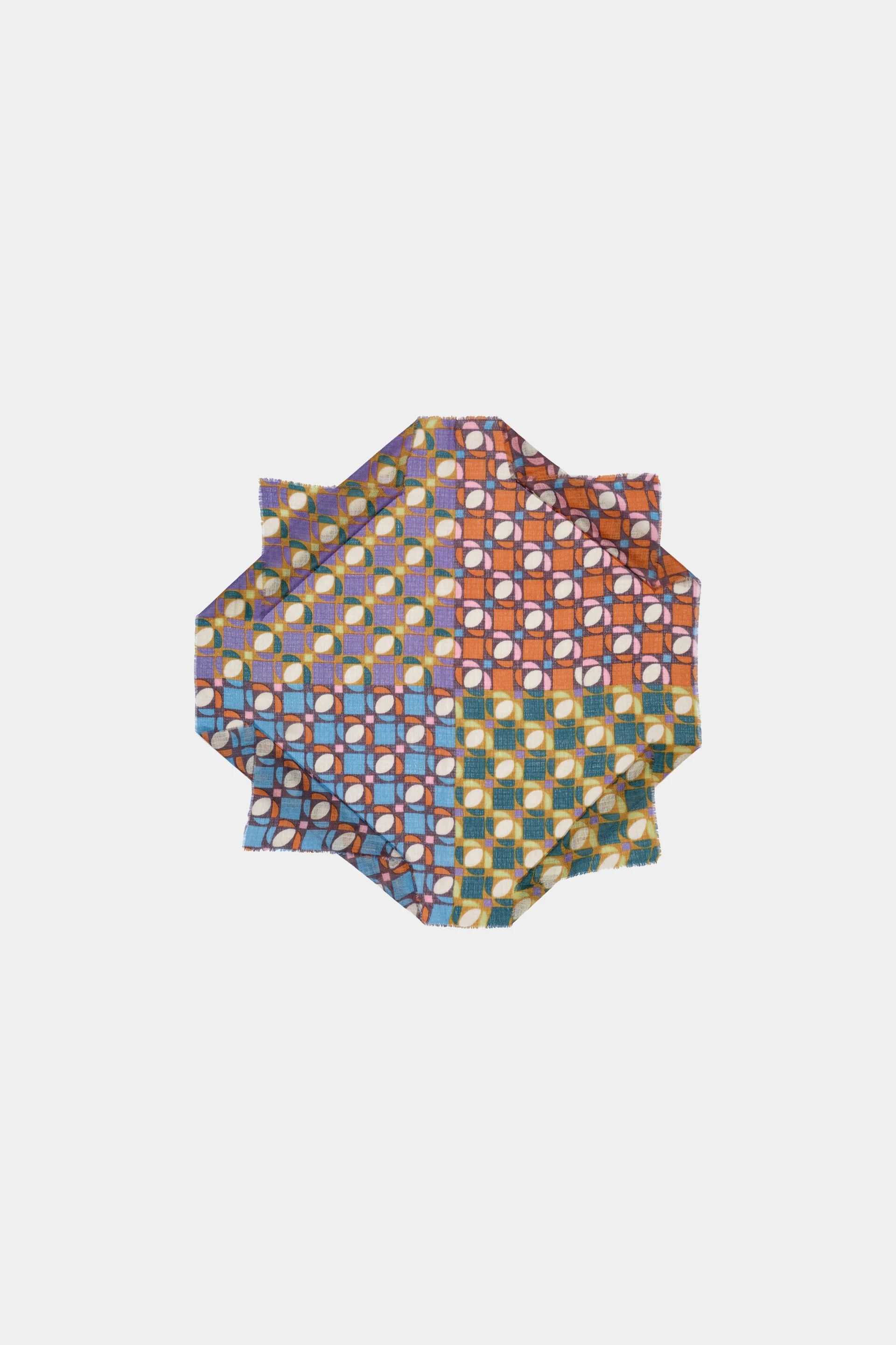This extra-large ÉPICE Paris Square Scarf GW2564 features a soft, delicately textured weave crafted from a luxurious blend of wool, silk, and cashmere. Its color-block pattern combines small, overlapping geometric shapes that create shifting optical effects, enhancing its refined aesthetic. When tied, the design’s vibrant interplay is fully revealed, framed by fine fringes for an elegant finish. Hand-screen printed with precision, each color is applied using a dedicated frame, ensuring exceptional detail and quality. Perfect for those who appreciate expert craftsmanship and sophisticated style.