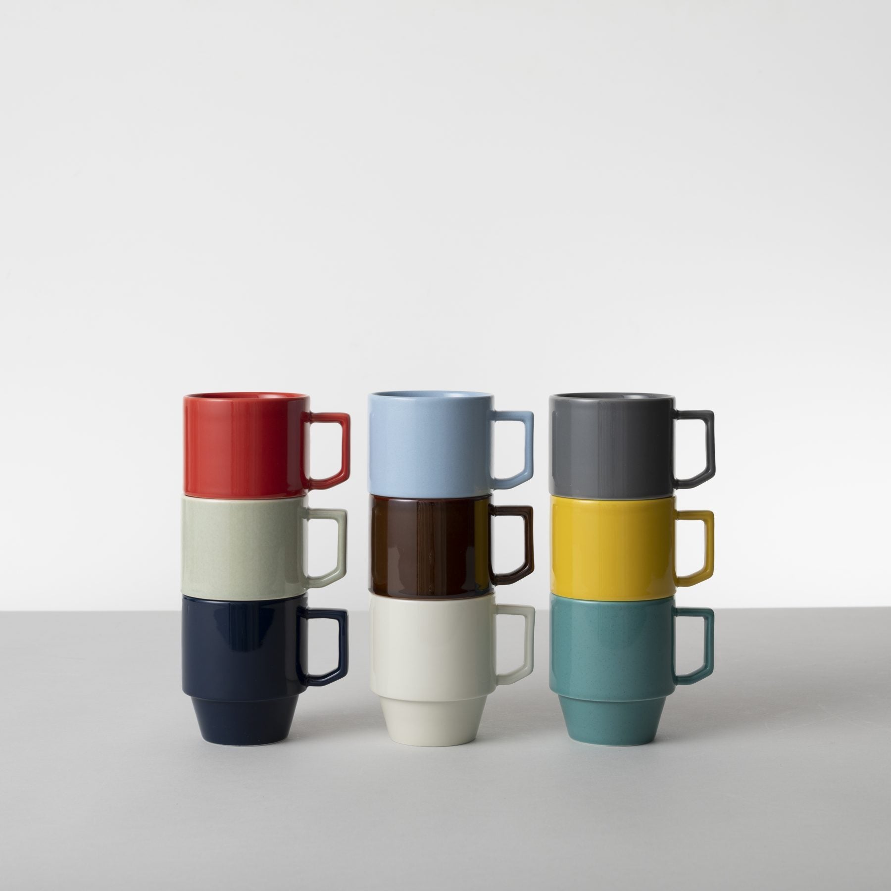 At 280 cc (just over 9 oz) this mug is as standard as it gets and can be stacked together with Block Mug. This mug is a joy to hold–the handle’s interior is curved with an angled bottom that provides stability. The smooth body interior has no corners, making it easy to clean.
