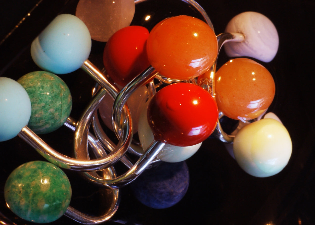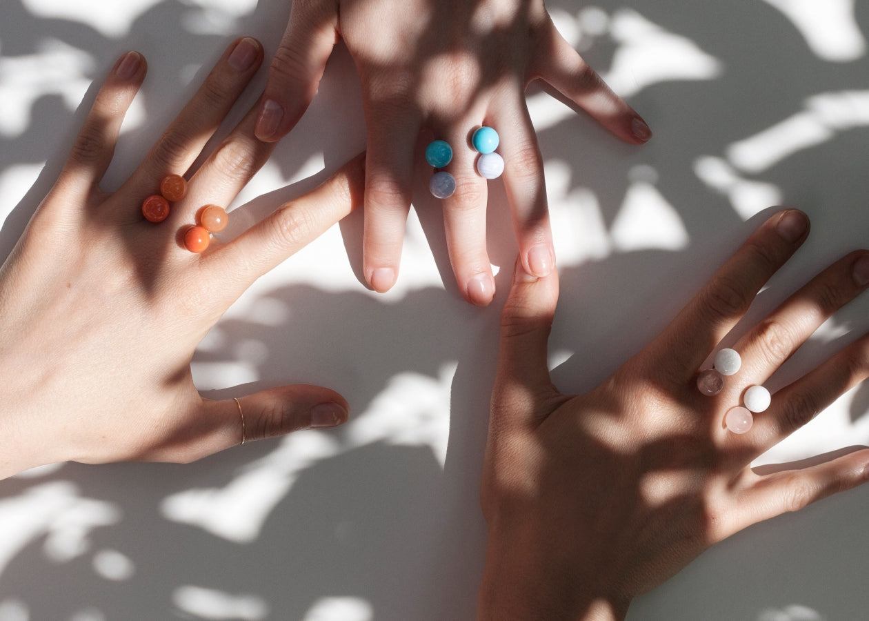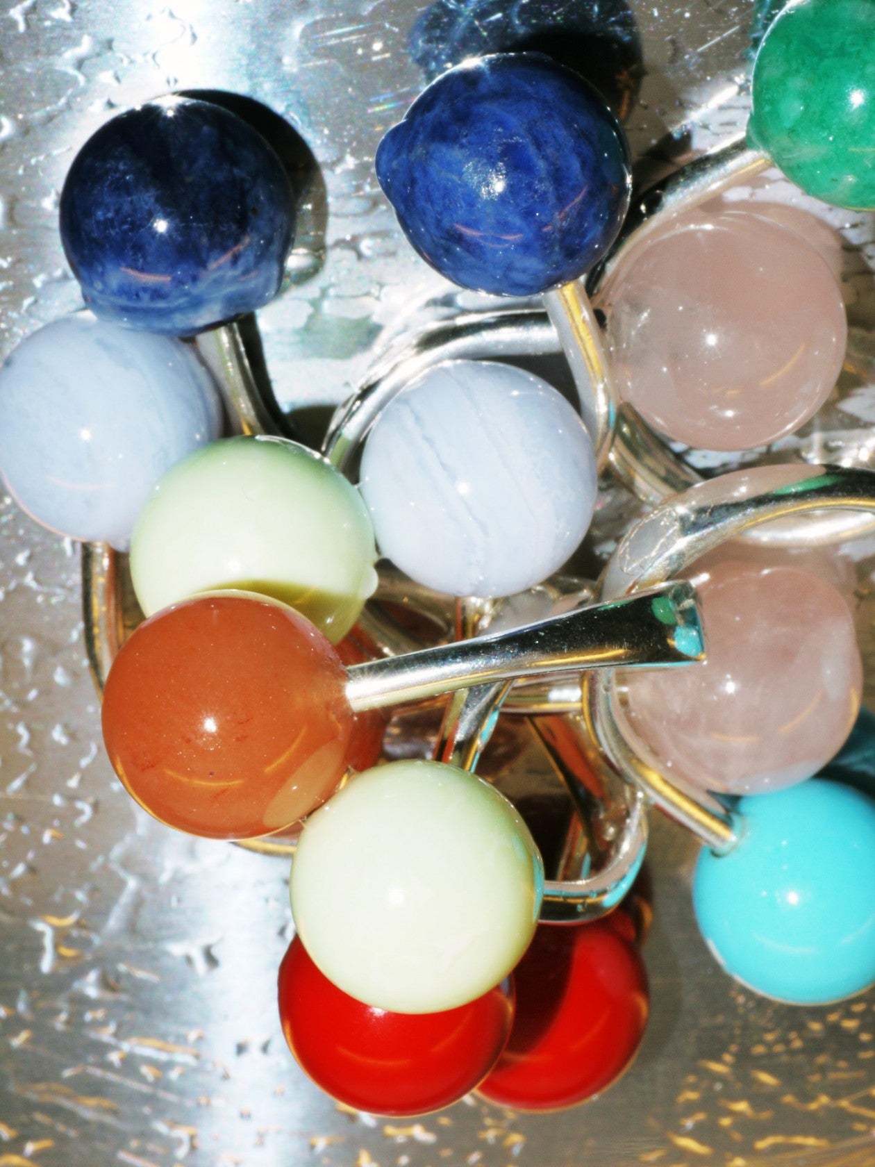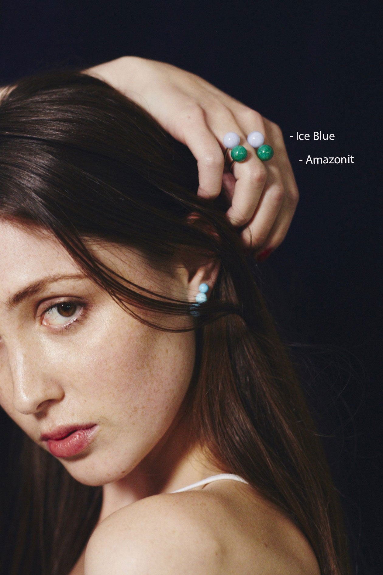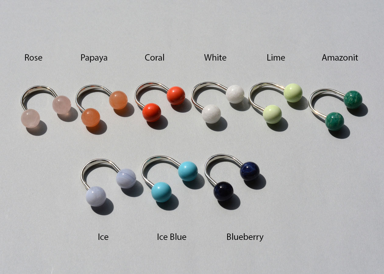 A ring with two spheres in a fresh colour. The spheres are out of semi precious stones in nine different colours. Model wears amazonit & ice-blue in the first picture, on the second: lime on the right and rose and papaya on the left hand. Third picture, from left to right: Rose Quarz (rose), Eosit (papaya), Coral (cherry), Dolomit (ice), Lemon Chrysopras (lime), Amazonit (dark green), Chalcedon (ice blue), Turquoise (turquoise), Sodalith (blueberry). Made in Munich.
