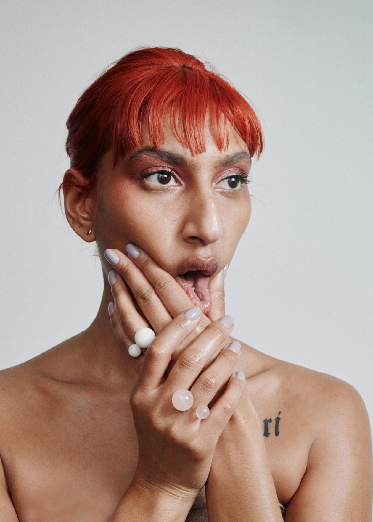An open ring with two spheres in a juicy colour out of semi precious stones in 3 different colours. The model wears the dolomite white & rose quartz.