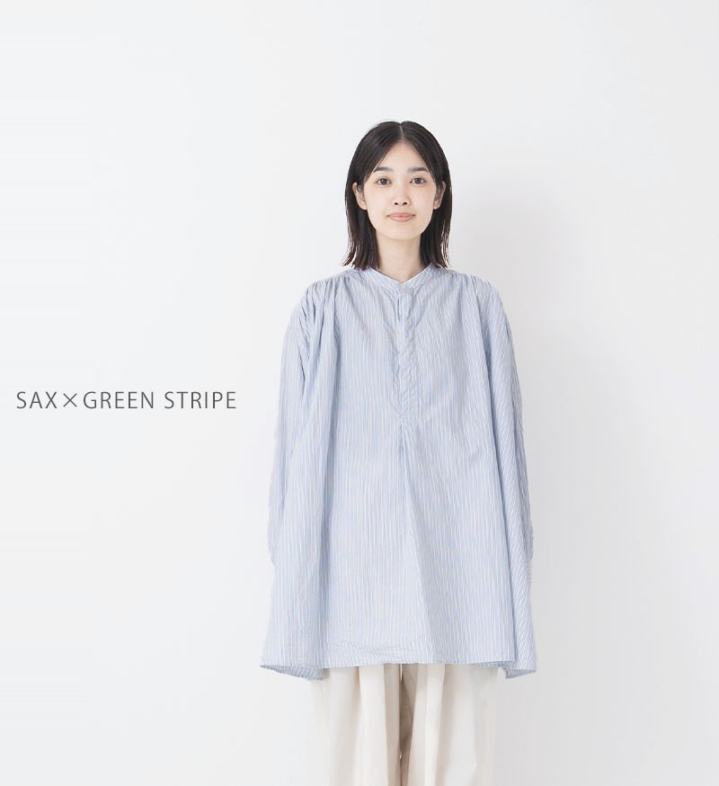 A pullover shirt with an A-line silhouette and fine gathers on the front and back for a roomy body. Comes with side pockets.