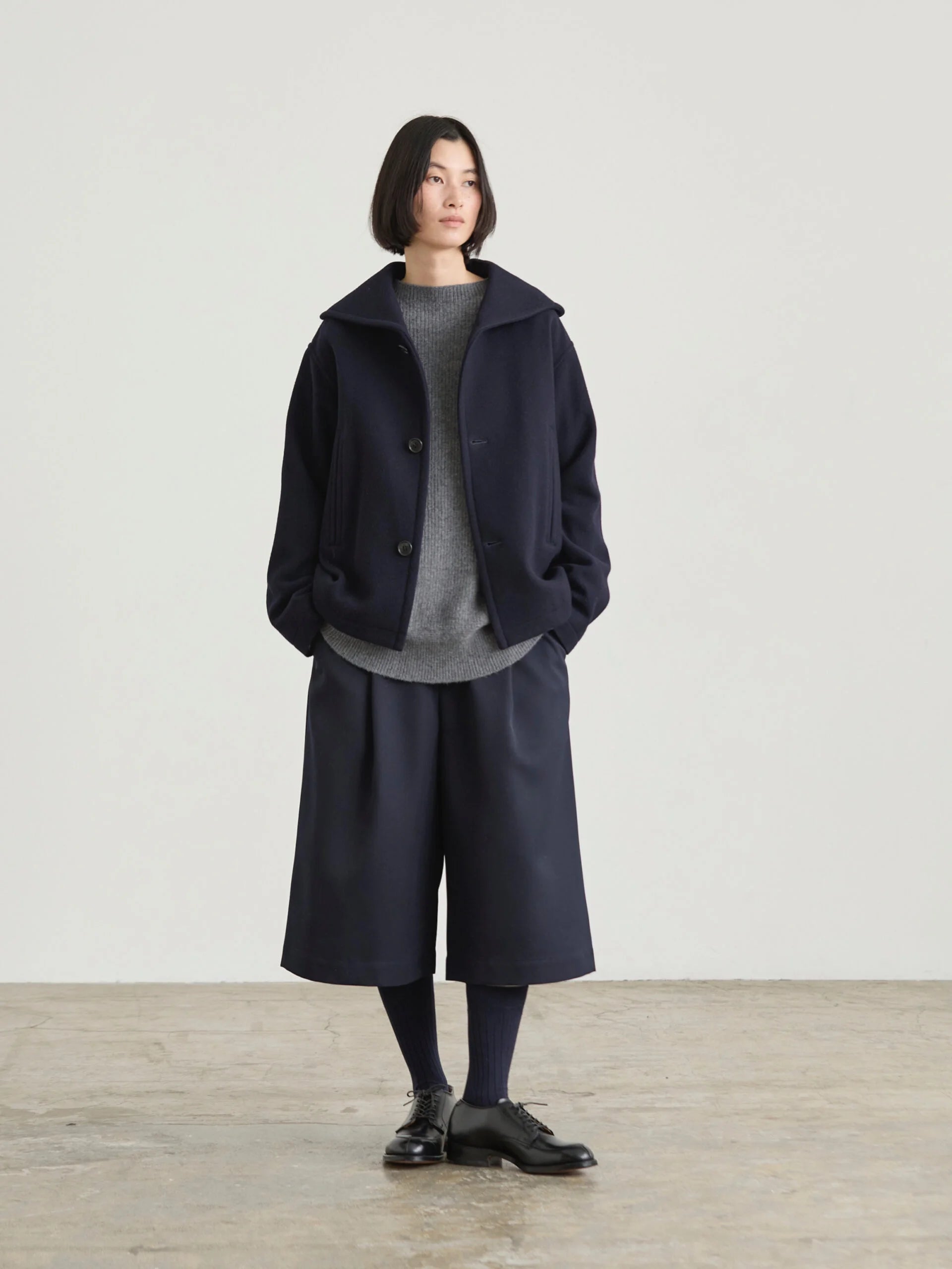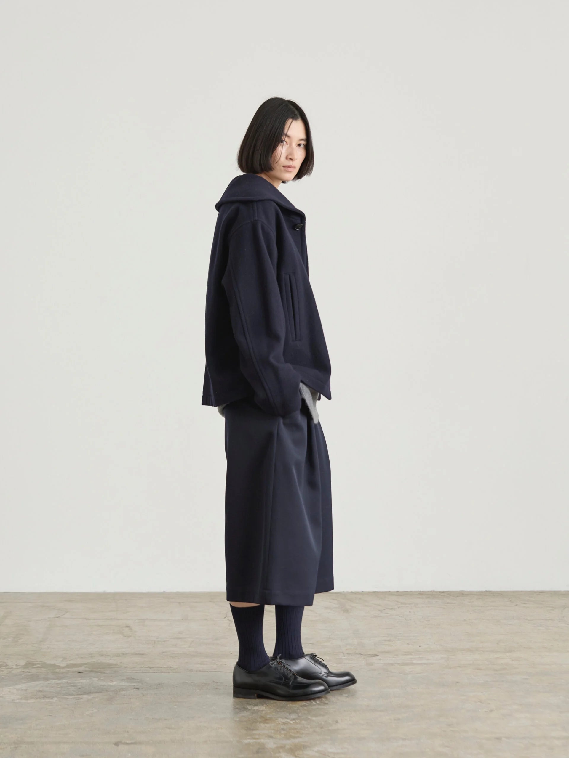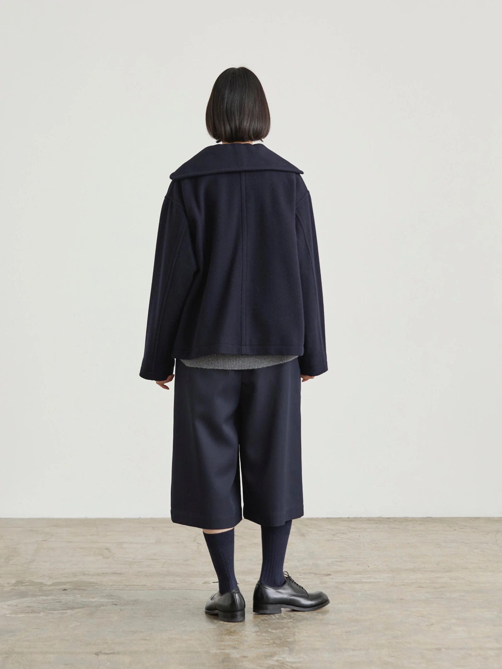 This short, wide wool coat is inspired by vintage British Navy duffle coats and classic peacoat styles. Made from Super 100 soft wool melton, it offers a refined texture and comfortable wear. Featuring double piping pockets, the design balances timeless charm with modern simplicity, making it an elegant and practical choice for everyday use.