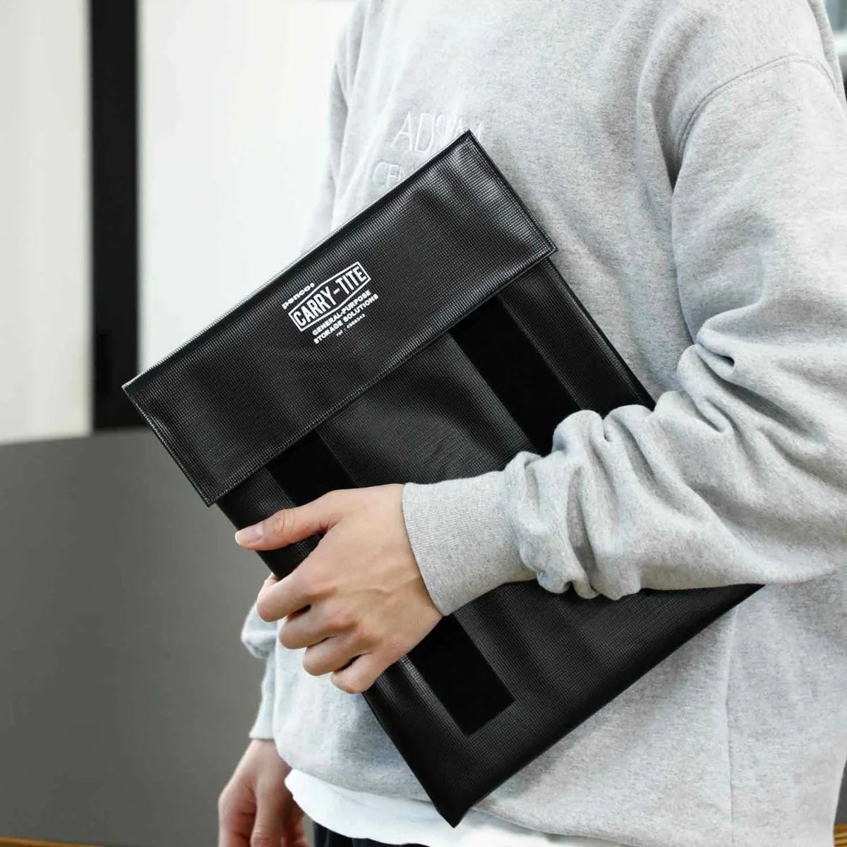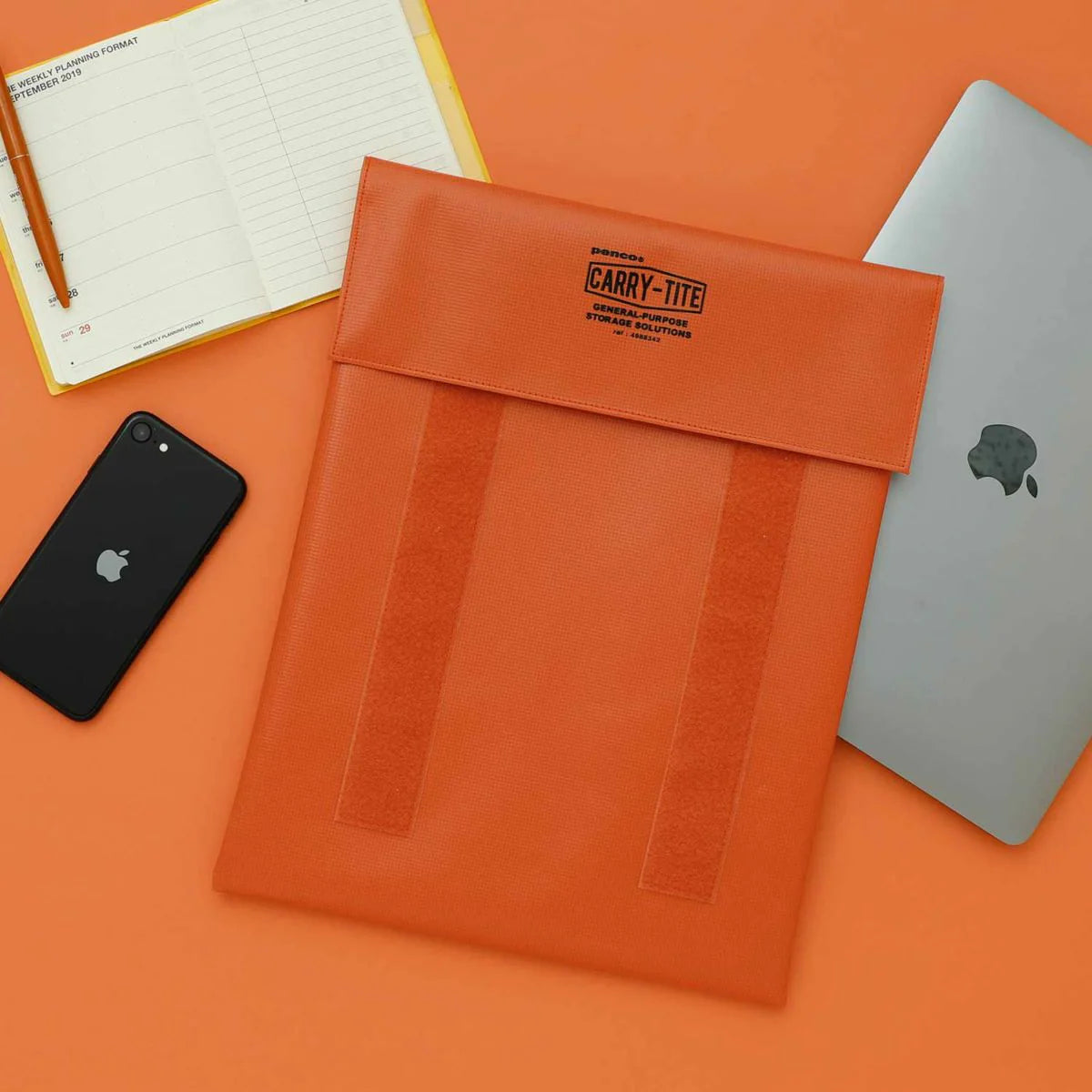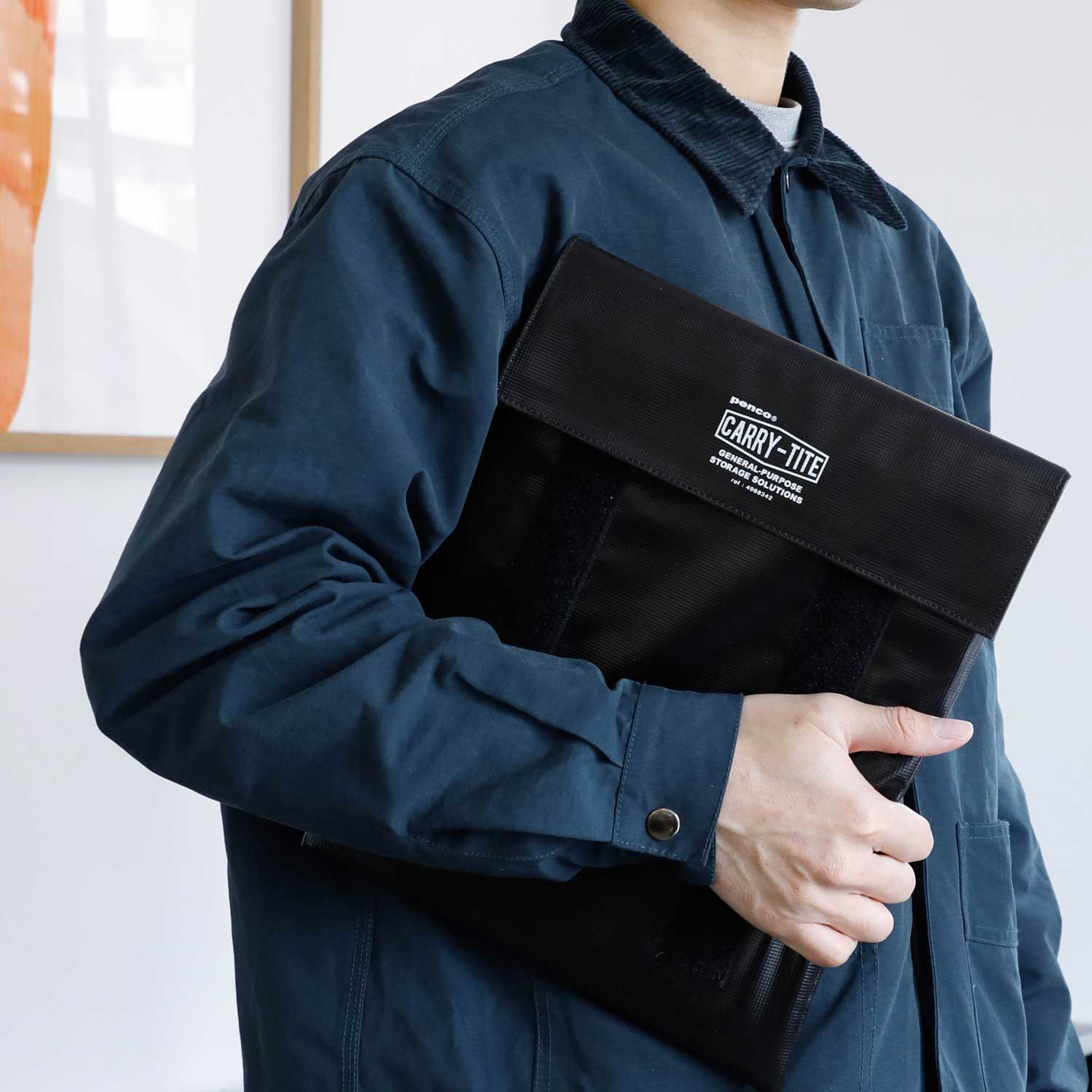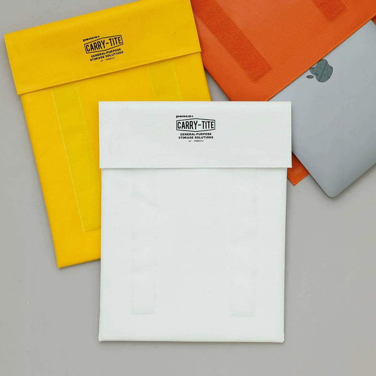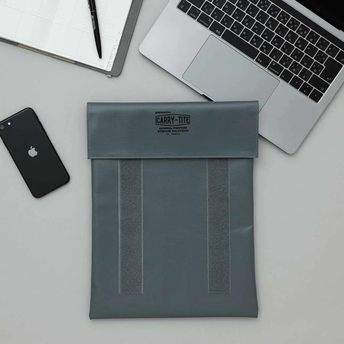 A laptop-size, 2-way versatile general purpose case made of PVC tarpaulin with velcro closures by Penco.
