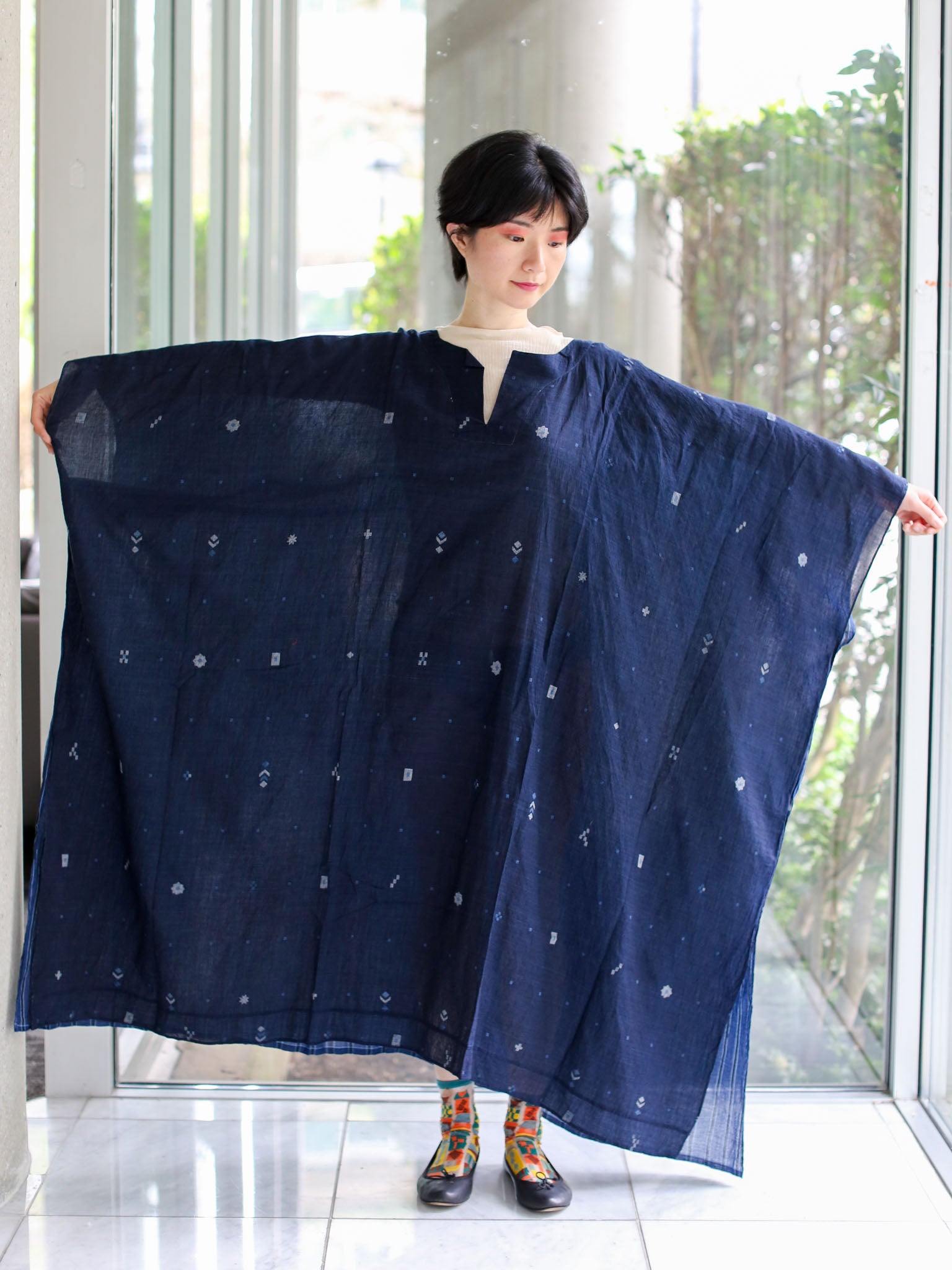 Shoulder width: no shoulder line, therefore flexible in the width; length: 118 cm; armpit-to-armpit: 130; hem width: 132