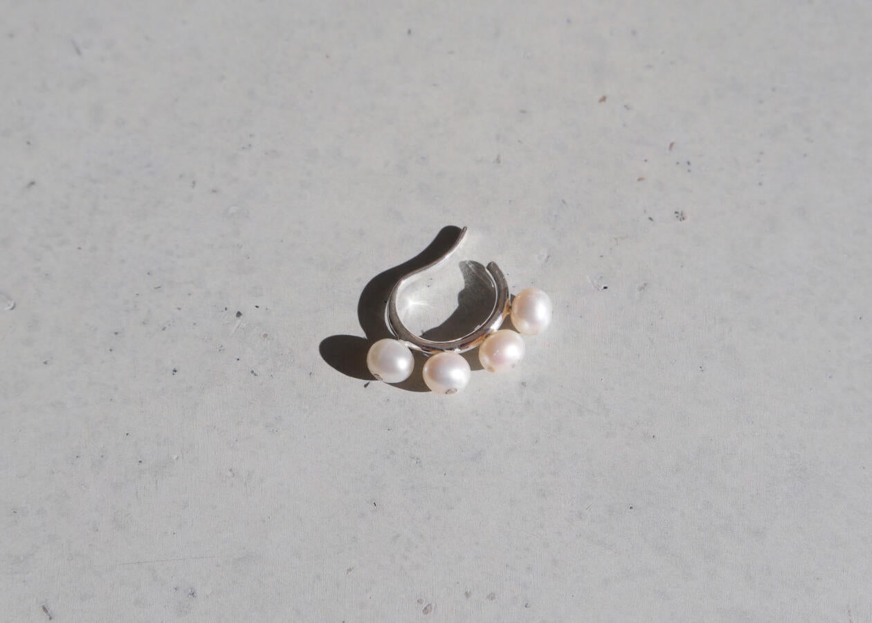 A bold wire earcuff with four freshwater pearls for the lower part of your ear. Materials are freshwater pearls and 925 sterling silver. Adjust it for perfect fit. No piercing needed. The ear cuff comes in one single piece.