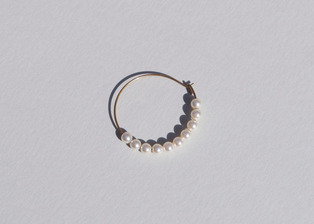 10 little freshwater pearls lined up on a delicate hoop made out of golden wire. For pierced ears. One single piece.