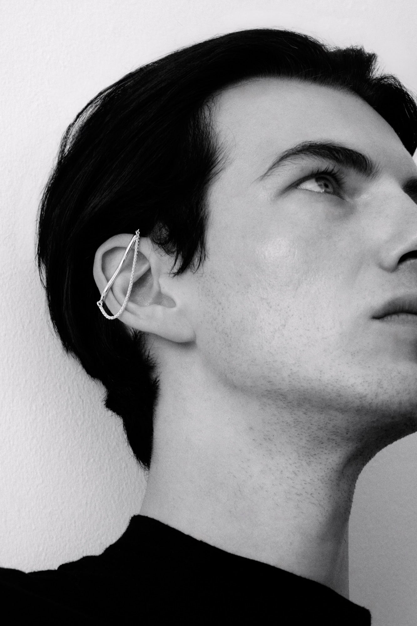 This earcuff is part of the collection called Rebl/Diez, a capsule of ear adornments by Saskia Diez for Tom Rebl, as a testament to their profound bond of mutual admiration and friendship. The collection features earcuffs and hoops made from Sterling Silver, adorned with an array of chain strands that occasionally intertwine with pearls.