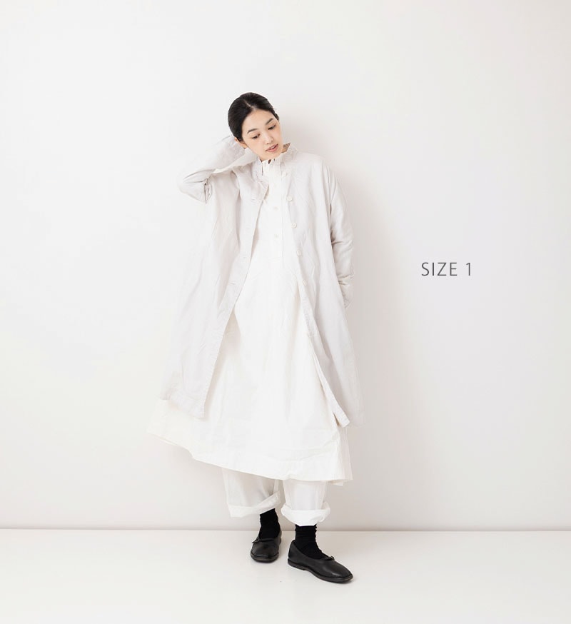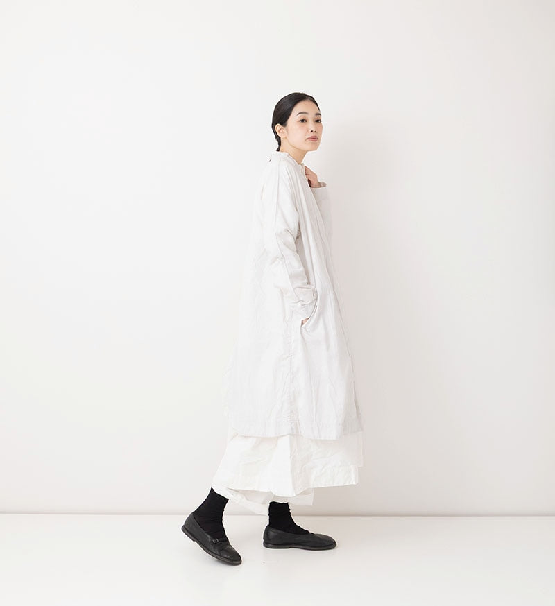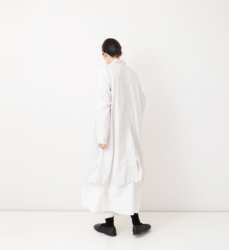 The Arrow Coat is named after the fact that there is no seam at the base of the sleeves, and when you spread your arms, the line looks like an arrow. When you wear it, the fabric fits your shoulders, creating a beautiful silhouette. There is a deep slit in the back, making it easy to move around in. It is unlined and lightweight, and the fabric is just right for an outer layer during the change of seasons. It is recommended as a jacket to wear indoors during the cold season. It is a useful piece to have in different colors.