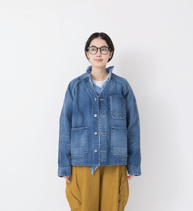 It features a clean no-collar design. This denim jacket has a loose fit and can be worn casually like a cardigan.