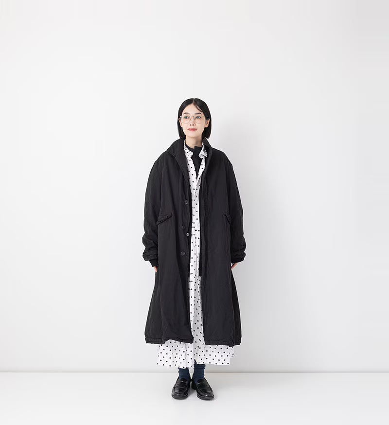 This long coat features a robust high-count cotton twill exterior layered with a lightweight cotton lining for comfort and structure. Garment-dyed using plant-based colorants—logwood and bayberry—the fabric develops a distinctive surface with gentle puckering that enhances its refined, relaxed character. The natural dyeing process yields a sophisticated depth that evolves gracefully with time and use.