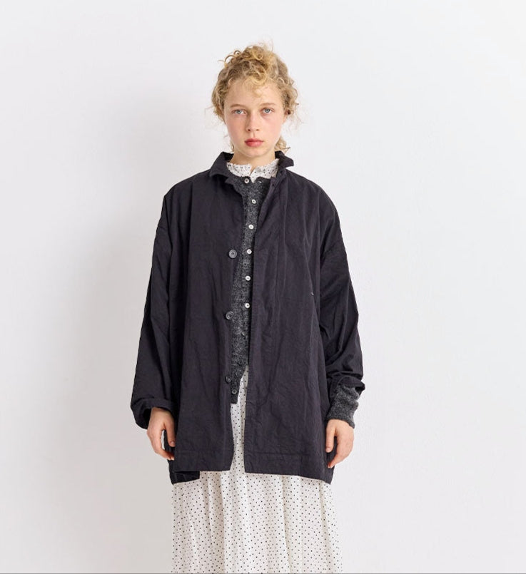 The Veritecoeur Garment Dye Short Coat is crafted from medium-weight, high-density cotton twill made with thick, high-quality combed yarn that minimizes fuzz. Its garment-dyeing process creates distinctive puckering throughout, giving the fabric a relaxed, lived-in appearance that looks stylishly authentic even unwashed. Featuring a boxy silhouette, the coat offers a clean front with a concealed placket and a small, tailored collar that can be buttoned up for a refined finish. Side pockets add practicality without disrupting its minimalist design.
